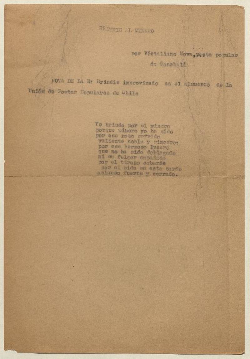 Brindis al minero [manuscrito] por Victaliano Nova.
