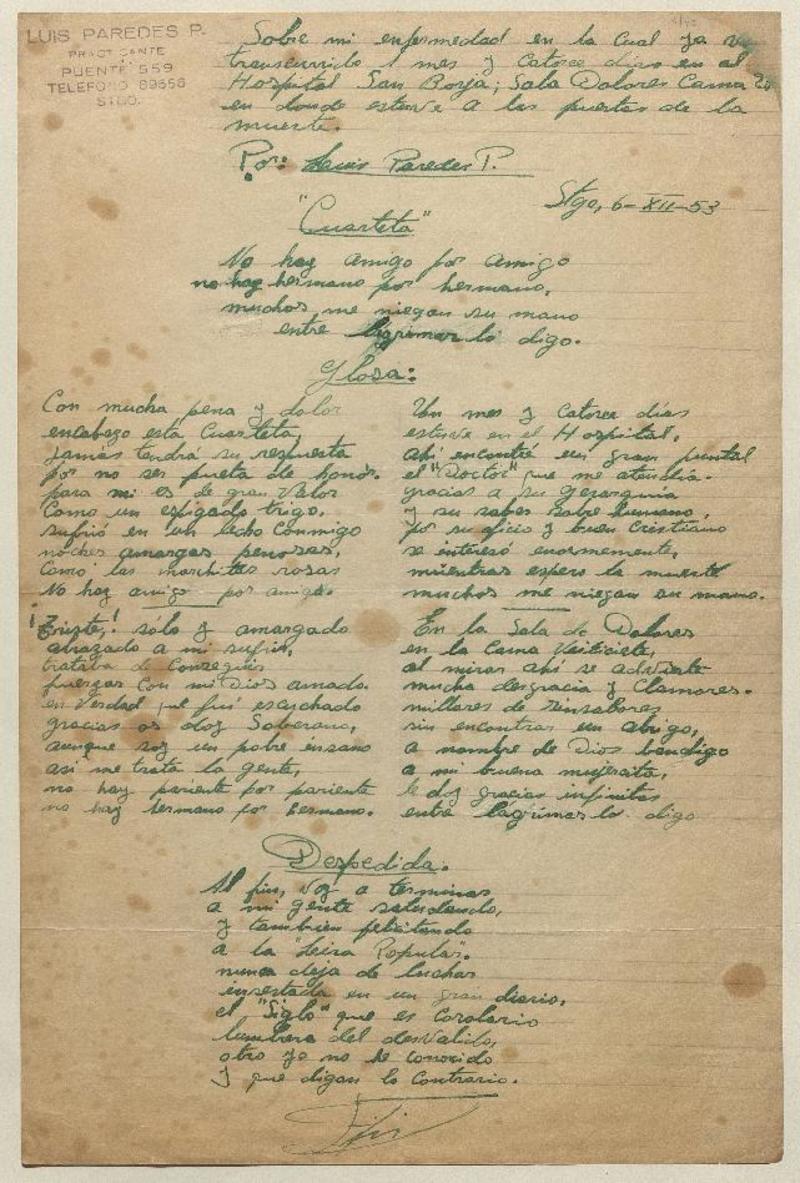 Sobre mi enfermedad... [manuscrito] por Luis Paredes P.