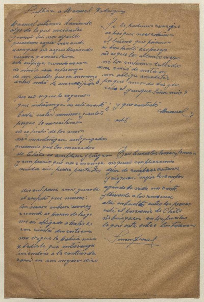 A mi bello Chile [manuscrito] por Pedro González.