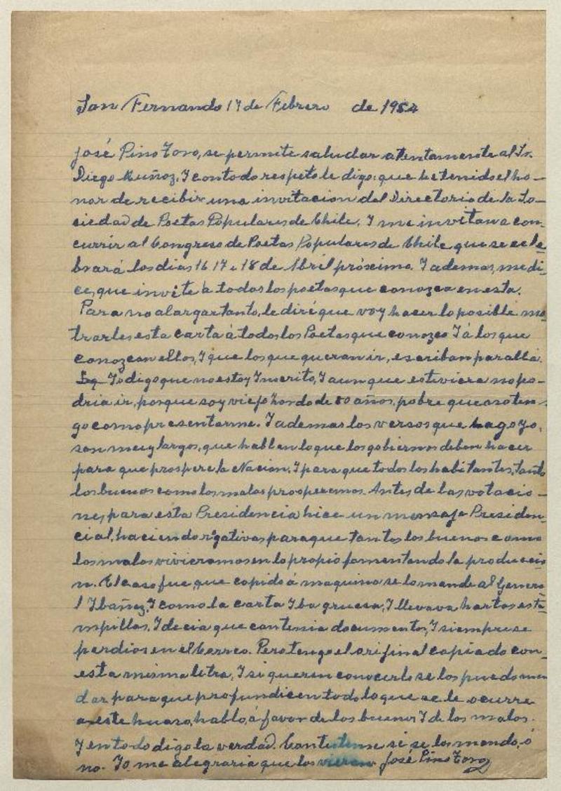San Fernando, Chile [a] Diego Muñoz Carta, 1954 febrero 14, [manuscrito] José Pino Toro.