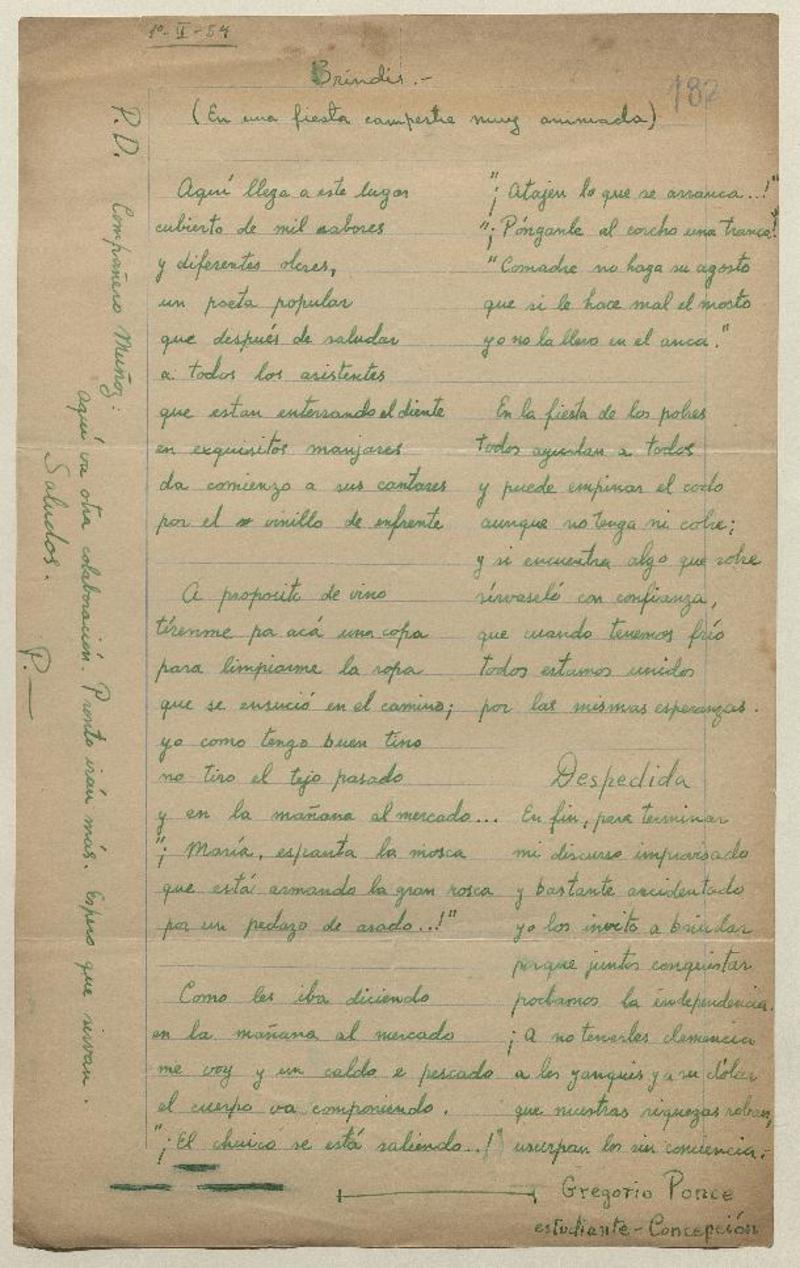Brindis [manuscrito] autora: Carmen Donoso Aguilera.