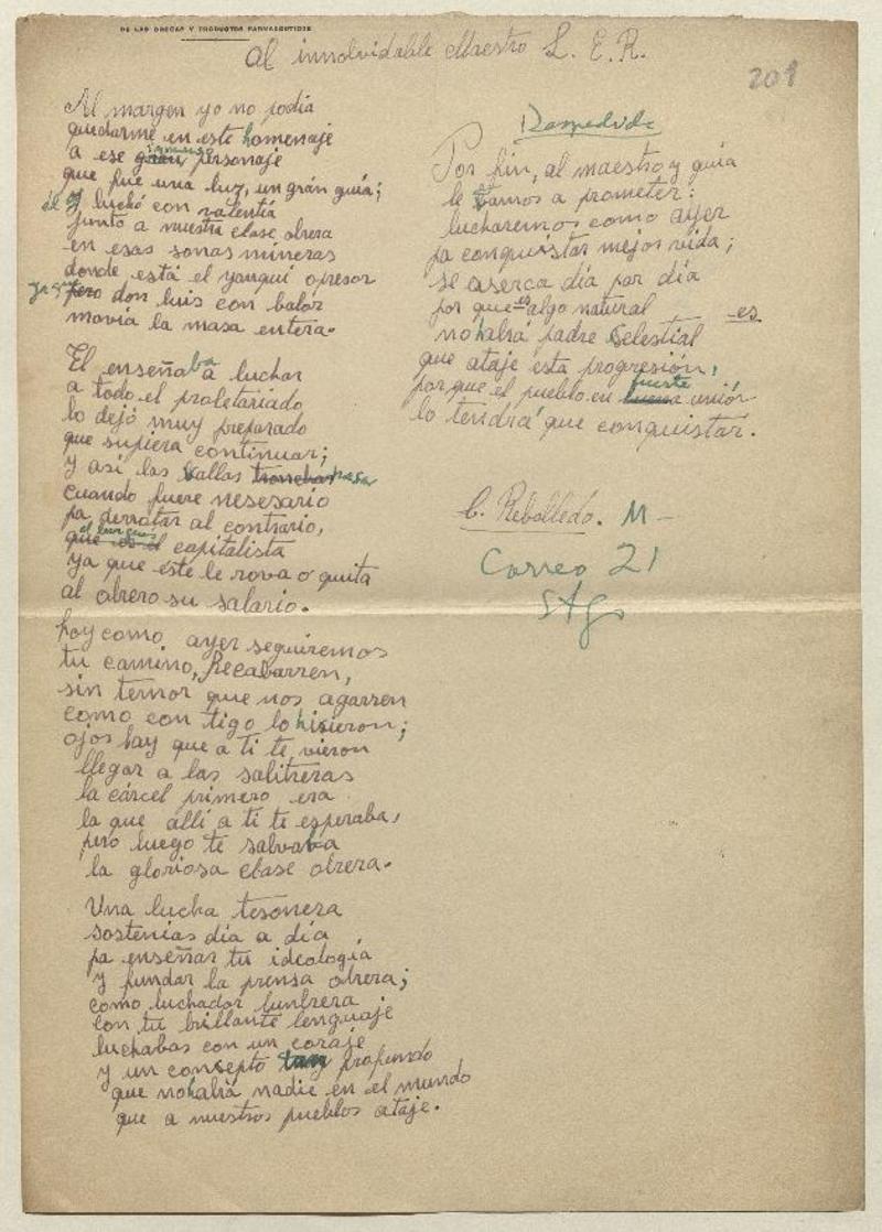 Al inolvidable maestro L. E. R. [manuscrito]