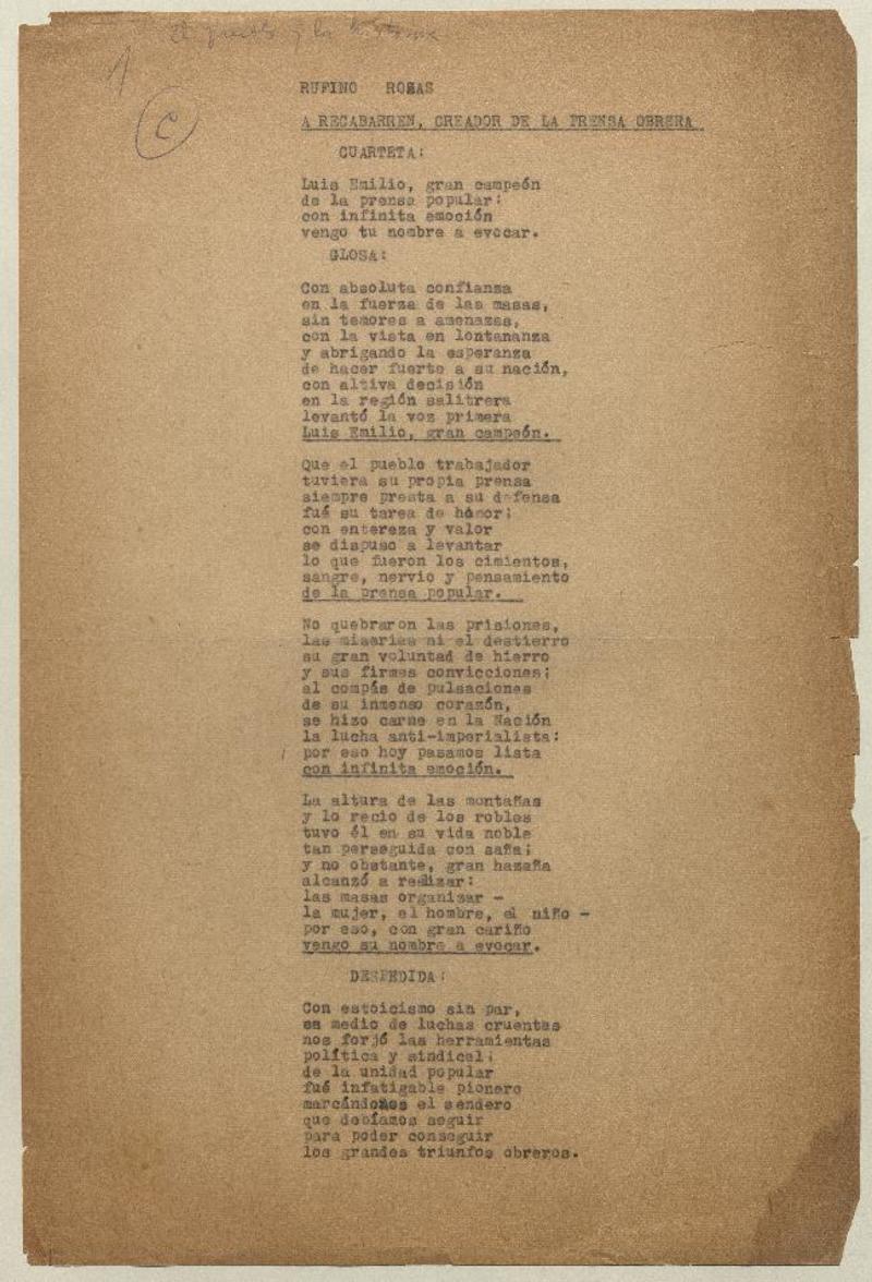 A Recabarren, creador de la prensa obrera [manuscrito] Rufino Rosas.