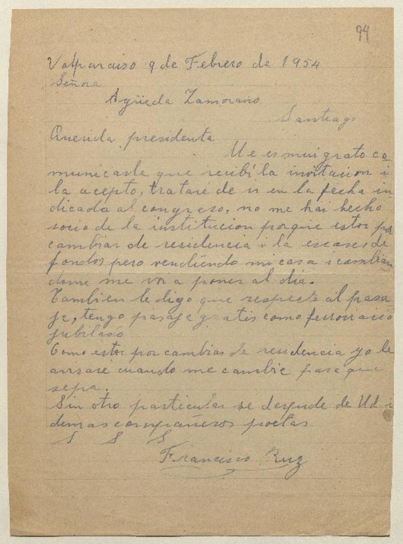 Valparaíso, Chile [a] Águeda Zamorano Carta, 1954 febrero 9 [manuscrito] Francisco Ruz