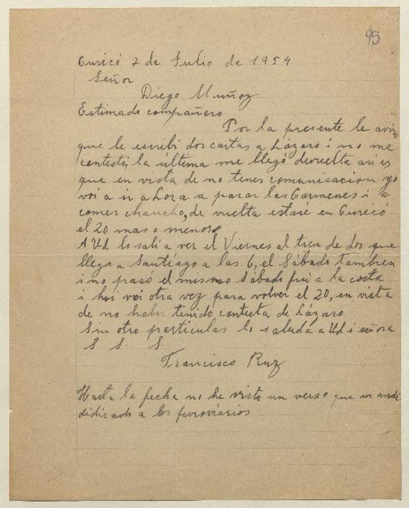 Curicó, Chile [a] Diego Muñoz Carta, 1954 julio 7 [manuscrito] Francisco Ruz.