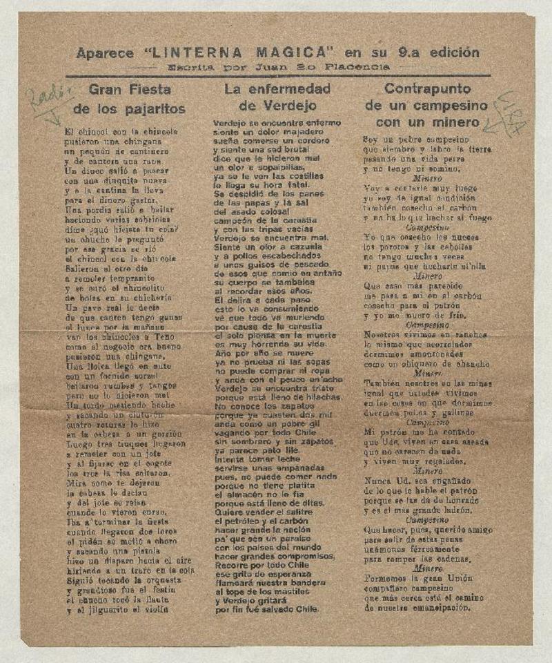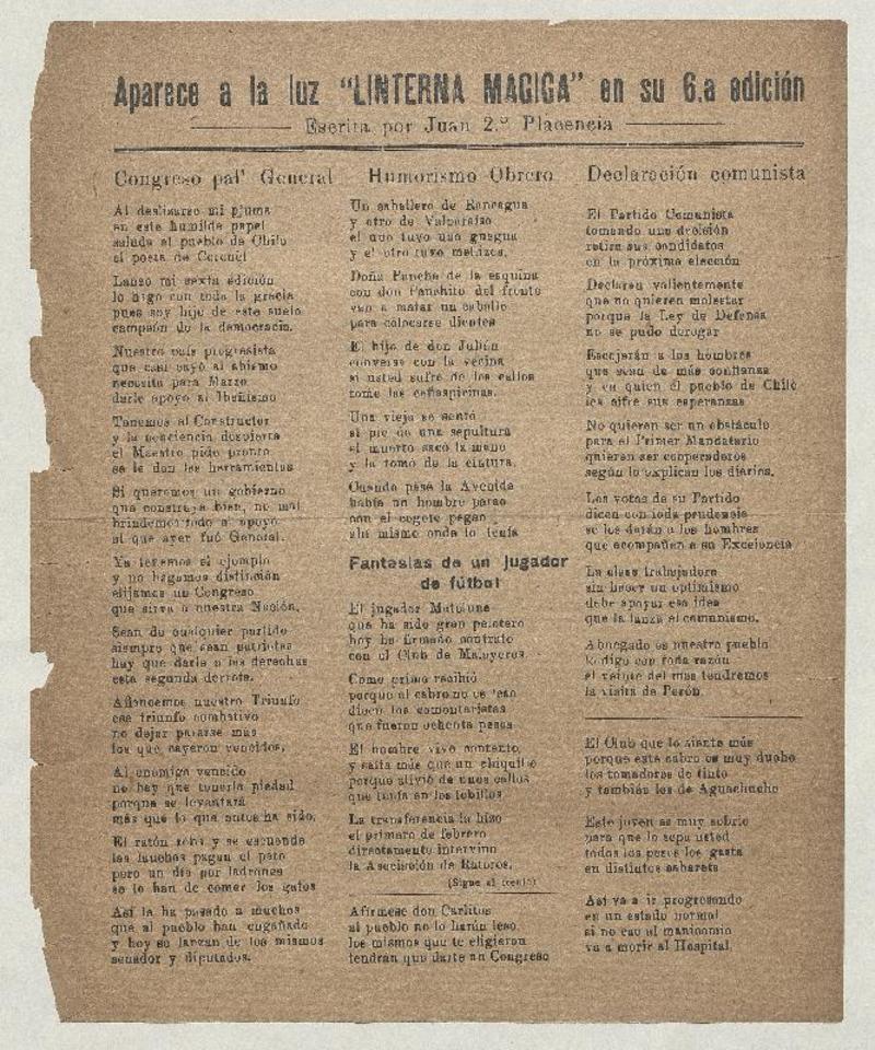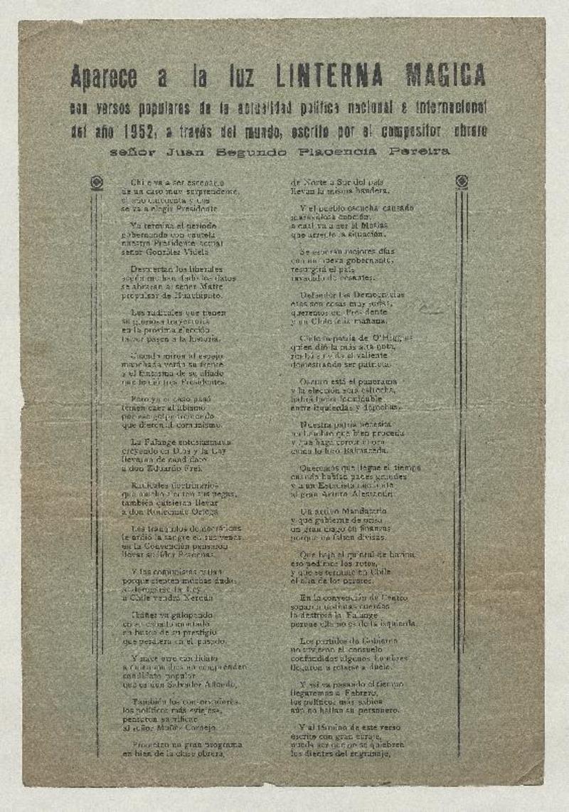 Aparece a la luz Linterna Magica con versos populares de la actualidad politica nacional e internacional del año 1952, a través del mundo escrito por el compositor obrero señor Juan Segundo Placencia Pereira.