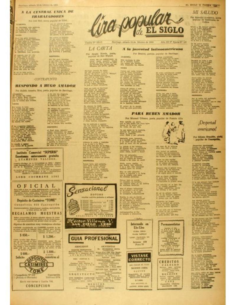 Viña del Mar, Chile [al] Director de la Lira popular Carta, 1953 octubre 22, [manuscrito] Roberto Bugueño.