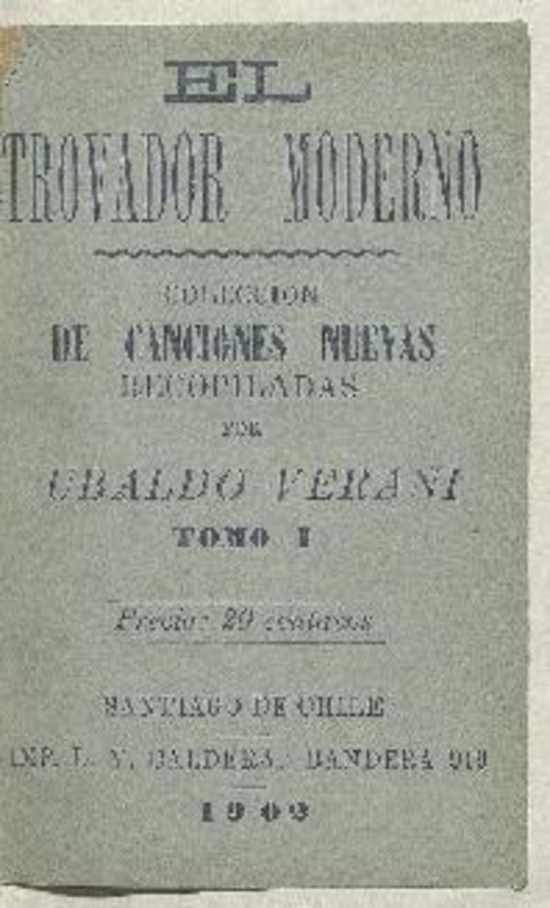 El Trovador moderno : colección de canciones nuevas : tomo I recopiladas por Ubaldo Verani.