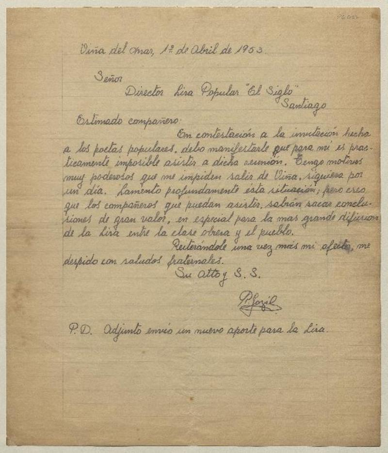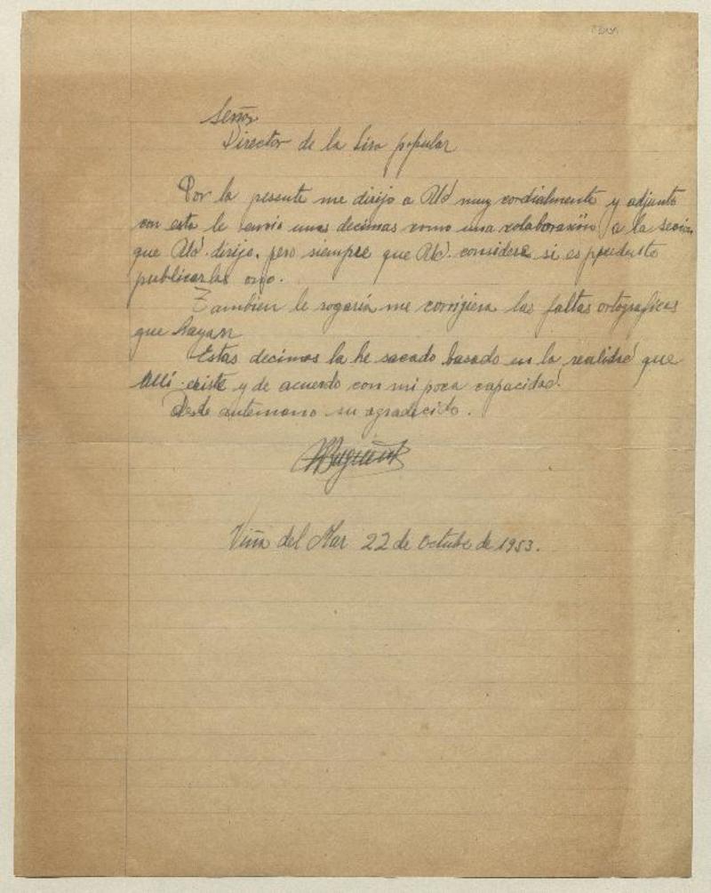 Viña del Mar, Chile [al] Director de la Lira popular Carta, 1953 octubre 22, [manuscrito] Roberto Bugueño.