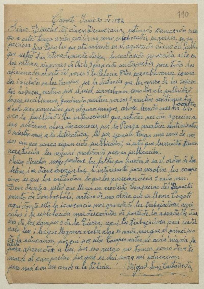 Cogotí, Chile [al] Director de diario Democracia Carta, 1952 junio 30, [manuscrito] Miguel Luis Castañeda.