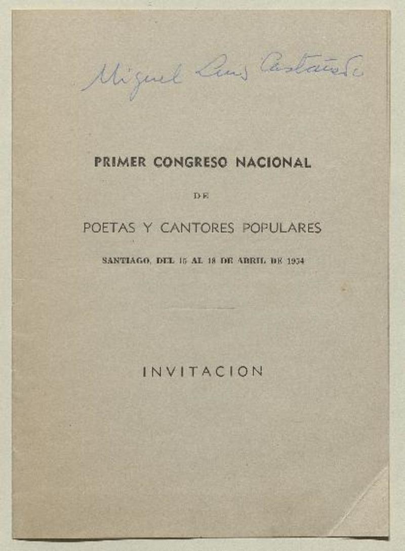 Primer Congreso Nacional de poetas y cantores populares Santiago, del 15 al 18 de abril de 1954 : invitación : programa [manuscrito]