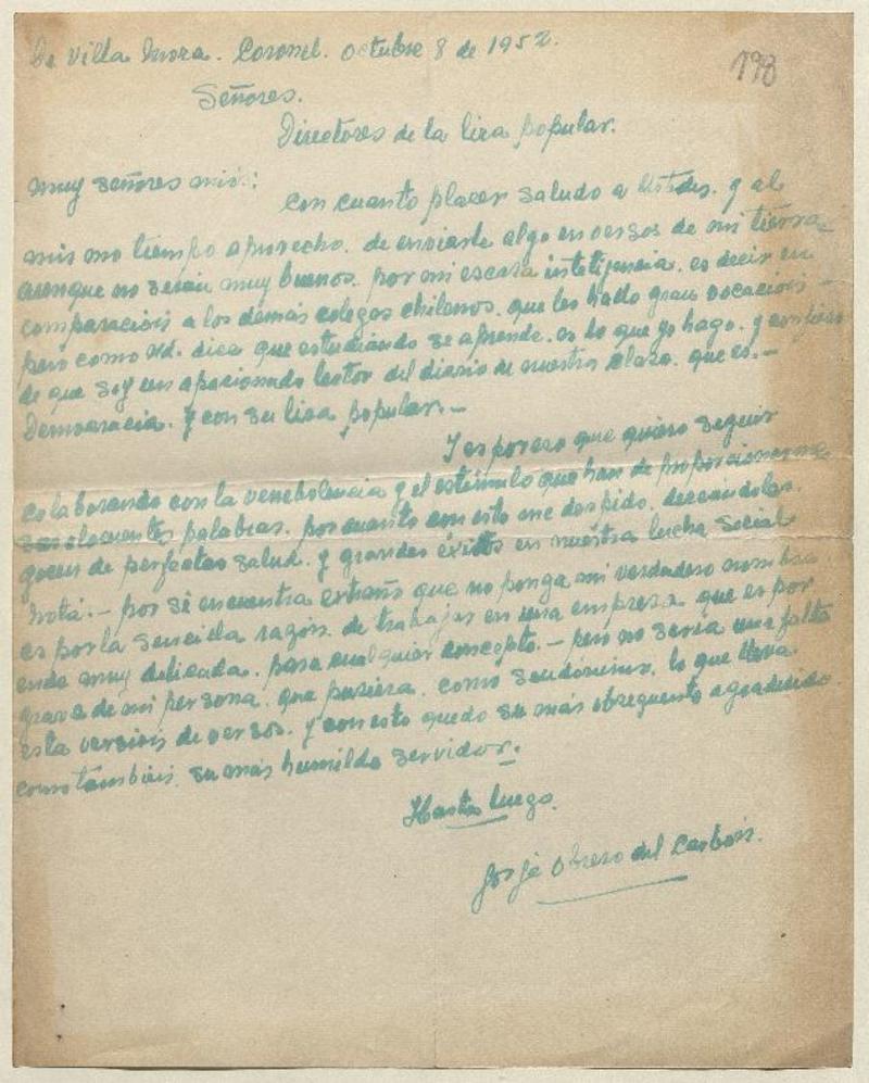 Villa Mora, Coronel, Chile [a] Directores de la Lira Popular Carta, 1952 octubre 8 [manuscrito] Jorge Obrero del Carbón.