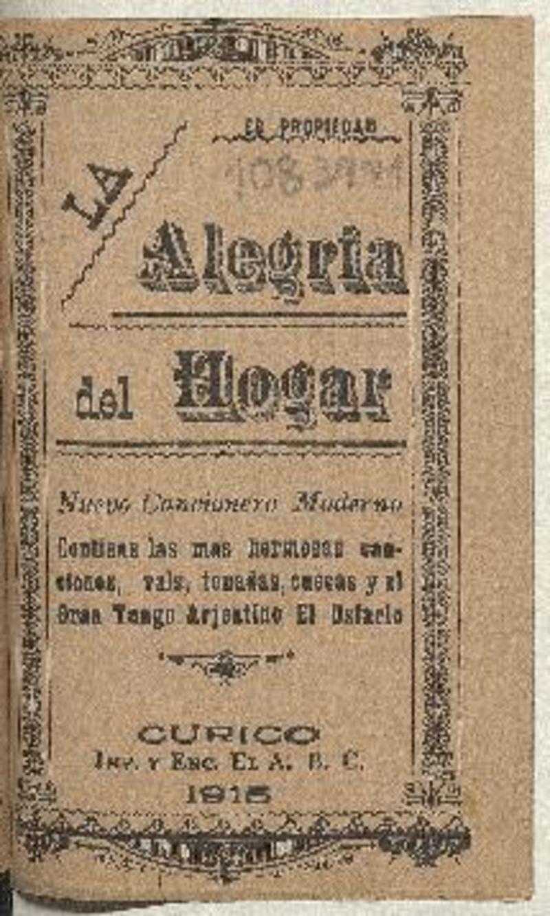 La Alegría del hogar : que contiene la más completa colección de canciones, valses, habaneras, vidalitas, cuecas, dúos, couplets de zarzuelas y operetas de renombrados autores, cuyo éxito está reconocido por todo el mundo : tonadas y cuecas de pata en quincha recopilados por M. Gallardo N.