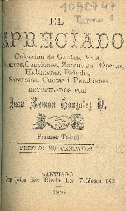 El Apreciado : colección de cantos, vals, mazurcas, canciones, zarzuelas, operas, habaneras, brindis, serenatas, cuecas i parabienes : primer tomo recopilados por Juan Ramón González O.