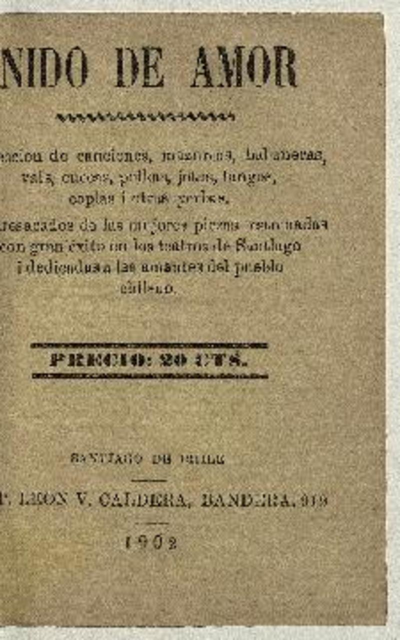Nido de amor : colección de canciones, mazurcas, habaneras, vals, cuecas, polkas, jotas, tangos, coplas i otras yerbas : entresacados de las mejores piezas entrenadas con gran éxito en los letreros de Santiago i dedicadas a las amantes del pueblo chileno.