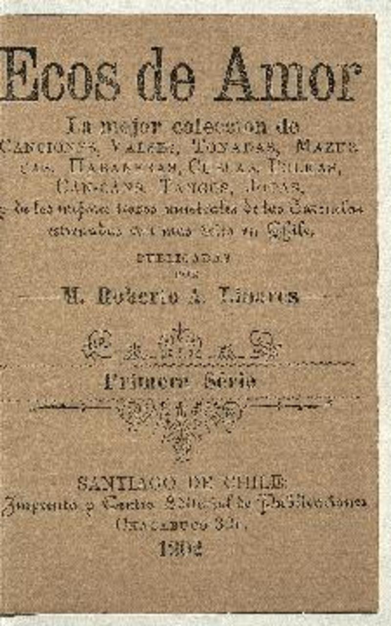 Ecos de amor : colección de valses, mazurcas, tangos, habaneras, jotas, tonadas, polkas, canciones y de los mejores trozos de las zarzuelas entrenadas con más éxito en Chile [publicadas por M. Roberto A. Linares].