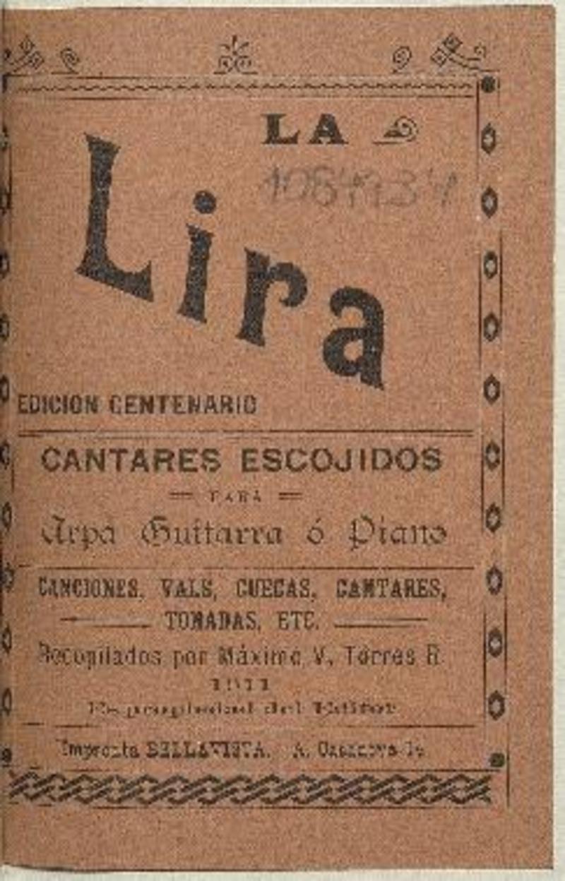 La Lira : cantares escojidos : para arpa, guitarra o piano : canciones, vals, cuecas, cantares, tonadas, etc. recopilados por Máximo V. Torres R.