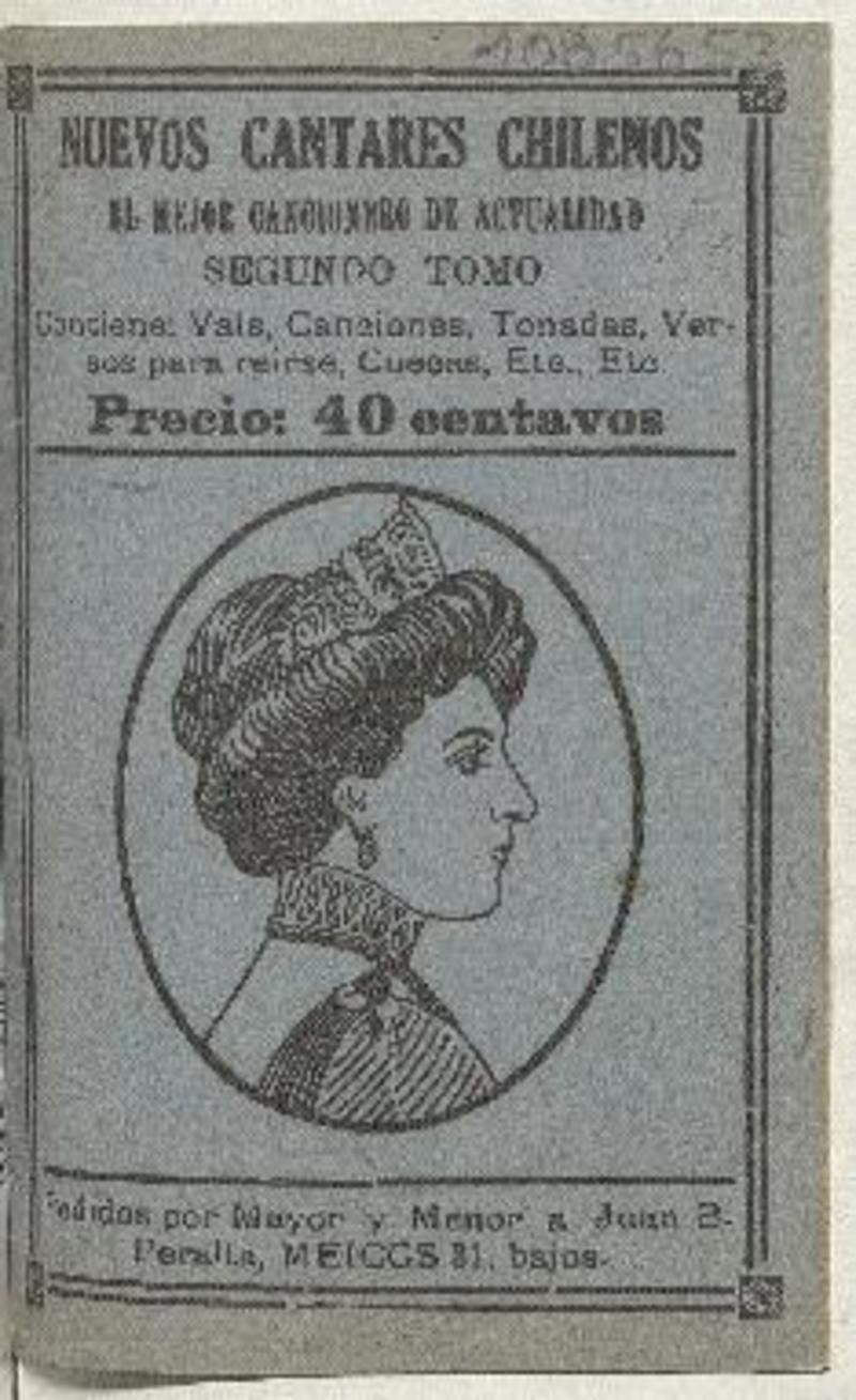Nuevos cantares chilenos : el mejor cancionero de actualidad : segundo tomo : contiene vals, canciones, tonadas, versos para reirse, cuecas etc., etc.