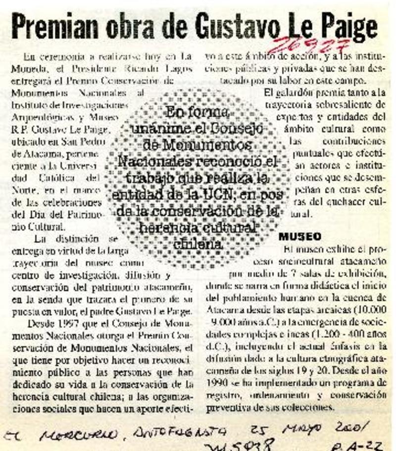 Premian obra de Gustavo Le Paige. [artículo]