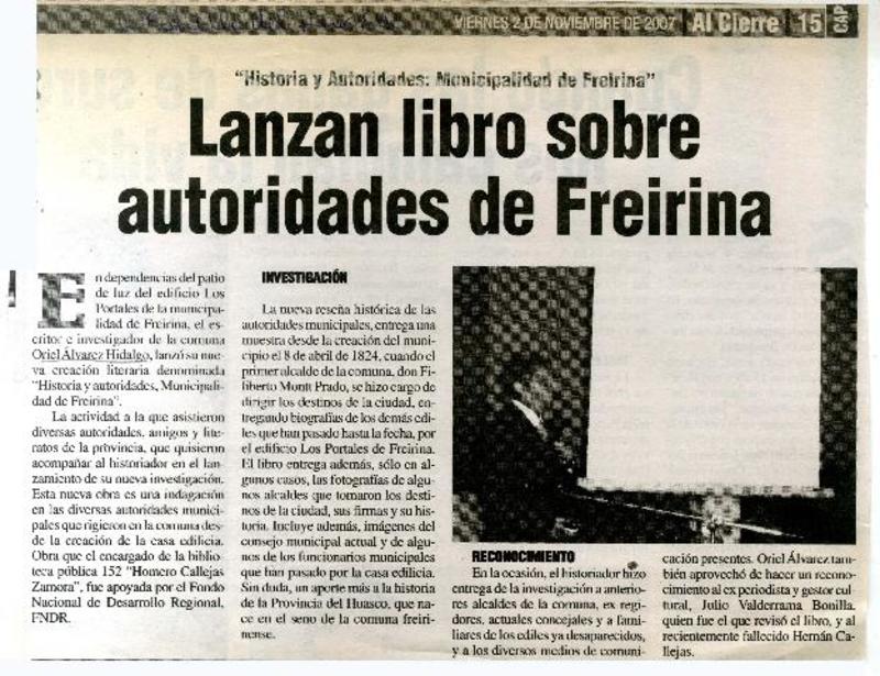 Lanzan libro sobre autoridades de Freirina. [artículo]