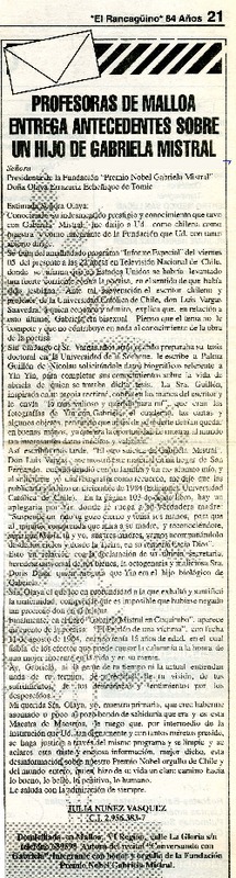 Profesoras de Malloa entrega antecedentes sobre un hijo de Gabriela Mistral [artículo] Juan Nuñez Vazquez.