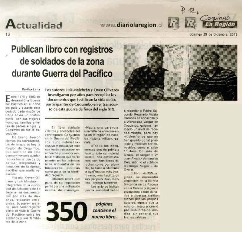 Publican libro con registros de soldados de la zona durante Guerra del Pacífico [artículo] Martiza Luna.