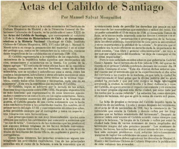 Actas del cabildo de Santiago [artículo] Manuel Salvat Monguillot.