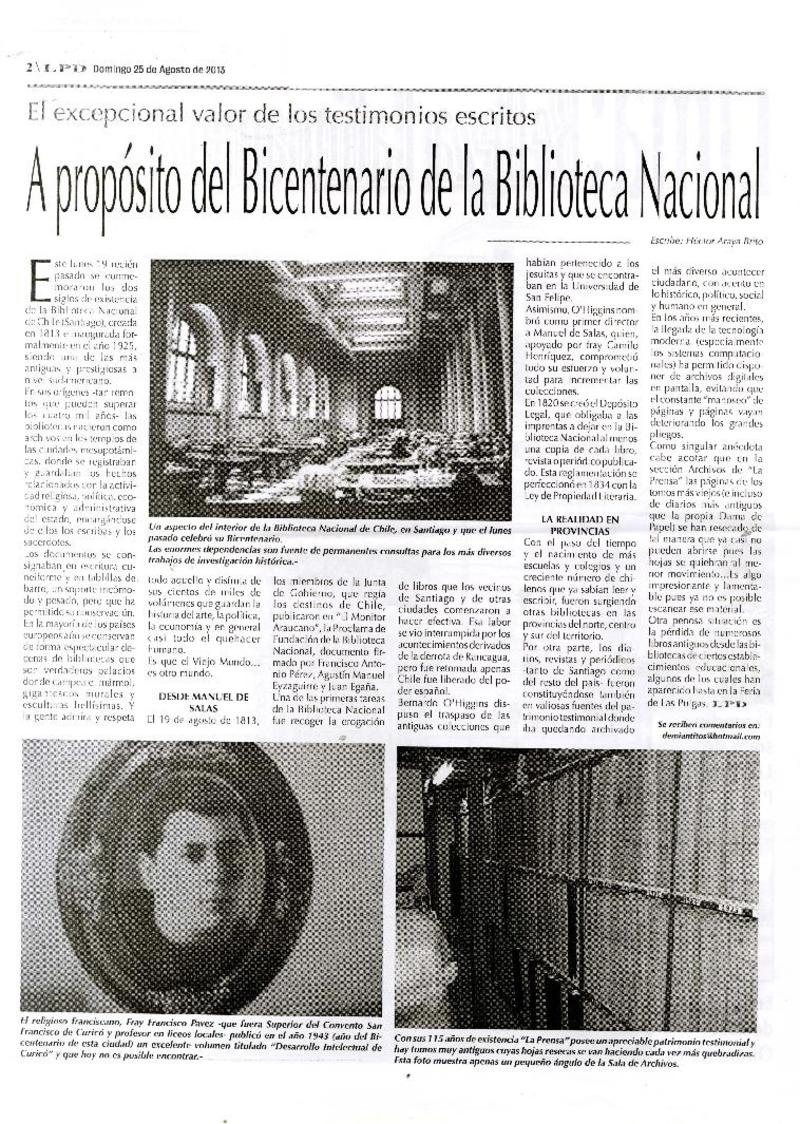 A propósito del Bicentenario de la Biblioteca Nacional [artículo] Héctor Araya Brito