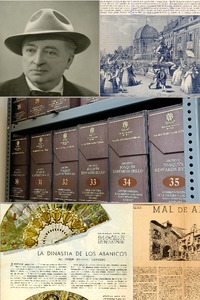 La caja contiene carpetas numeradas de la 1.1 a la 1.39, que incluyen una variada colección de temas, desde "Abanicos" hasta "Actores. Cine". Este conjunto refleja una amplia gama de intereses, abarcando distintos aspectos culturales y sociales.