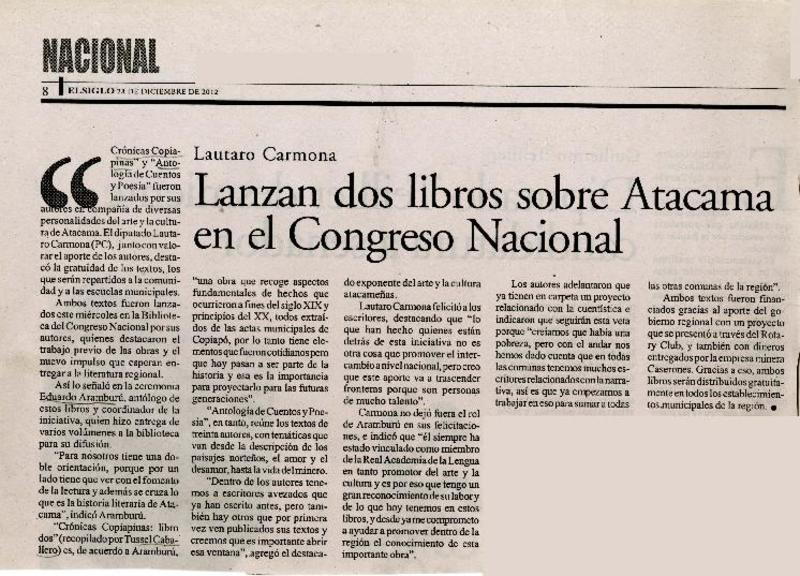 Lanzan dos libros sobre Atacama en el Congreso Nacional. [artículo]