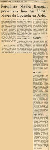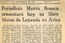 Periodista Maura Brescia presentará hoy su libro Mares de Leyenda en Arica. [artículo] La Defensa (Arica, Chile)-- sept. 1, 1982, p. 5. .