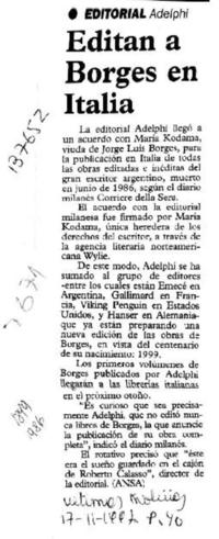Editan a Borges en Italia [artículo]. Las Últimas Noticias (Diario : Santiago, Chile)-- feb. 17, 1997, p. 40 .