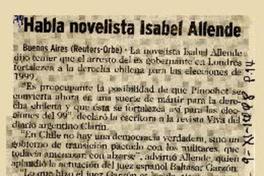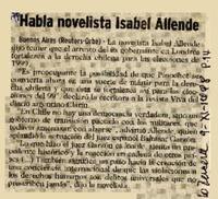 Habla novelista Isabel Allende [artículo]. La Tercera (Diario : Santiago, Chile)-- noviembre 9, 1998, página 14. .
