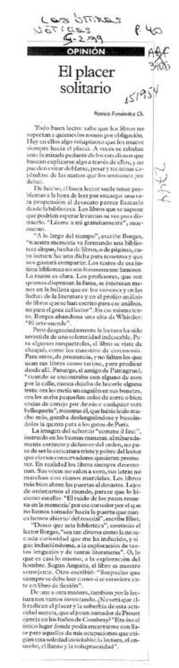 El placer solitario [artículo] / Patricio Fernandez Ch. Las Últimas Noticias (Diario : Santiago, Chile)-- feb. 5, 1999, p. 40 .