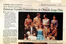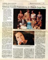 Estrenan versión posmoderna de obra de Jorge Díaz [artículo]. El Mercurio (Diario : Santiago, Chile)-- abril 3, 1999, p. .
