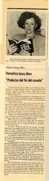 Periodista lanza libro "Profecías del fin del mundo" [artículo]. La Prensa Austral. -- diciembre 18, 1987, página 13 .