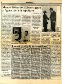 Manuel Eduardo Hübner, genio y figura hasta la sepultura [artículo] / Sergio Gutiérrez Patri. Fortín Mapocho (Chile)-- marzo 7, 1988, página 6. .