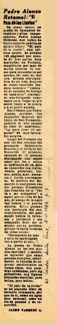 Pedro Alonzo Retamal, "El país de las lluvias" [artículo] / Jaime Vásquez A. El Cóndor (Diario : Santa Cruz, Chile)-- febrero 5, 1986, p. 3. .