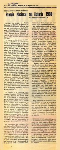 Premio Nacional de Historia 1988 [artículo] / Cheno Jorquera F. La Tribuna (Los Angeles). -- ago. 16, 1988, p. 2. .