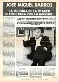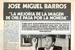 José Miguel Barros diplomático, "La mejoría de la imagen de Chile pasa por La Moneda" [artículo] / Raquel Correa. Cosas. -- no. 258 (ago. 21, 1986) p. 15-17 retr. .