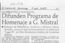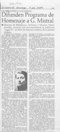Difunden programa de homenaje a G. Mistral. [artículo] El Mercurio (Diario : Santiago, Chile)-- febrero 3, 1989, página C5. .
