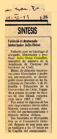 Falleció el destacado historiador Julio Heise [artículo]. La Epoca. -- jul. 14, 1989, p. 25 .