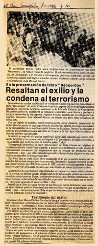 Resaltan el exilio y la condena al terrorismo [artículo]. El Sur (Diario : Concepción, Chile)-- feb. 7, 1986, p. 10 retr. .