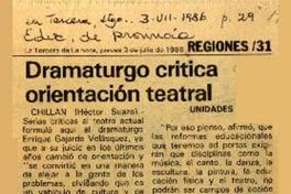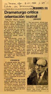 Dramaturgo critica orientación teatral [artículo] / Héctor Suazo. La Tercera. -- Ed. de provincia. -- jul. 3, 1986, p. 29 retr. .