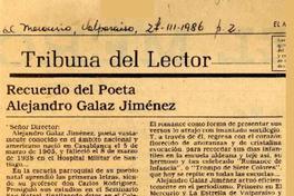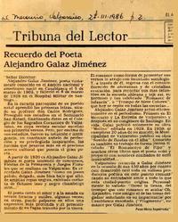 Recuerdo del poeta Alejandro Galaz Jiménez [artículo] / Juan Meza Sepúlveda. El Mercurio (Valparaíso). -- mar. 27, 1986, p. 2. .