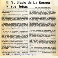 El sortilegio de La Serena y sus letras [artículo] / Carlos René Ibacache. El Día (Diario : La Serena, Chile)-- feb. 22, 1986, p. 3. .