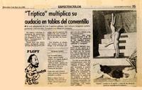 "Tríptico" multiplica su audacia en tablas del conventillo [artículo]. Las Últimas Noticias (Diario : Santiago, Chile)-- abr. 2, 1986, p. 35 .