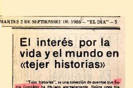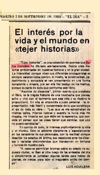 El interés por la vida y el mundo en "Tejer historias" [artículo] / Luis Aguilera. El Día (Diario : La Serena, Chile)-- sept. 2, 1986, p. 5. .