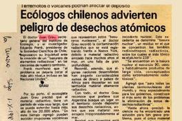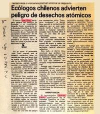 Ecólogos chilenos advierten peligro de desechos atómicos [artículo]. La Tercera. -- oct. 1, 1986, p. 4. .