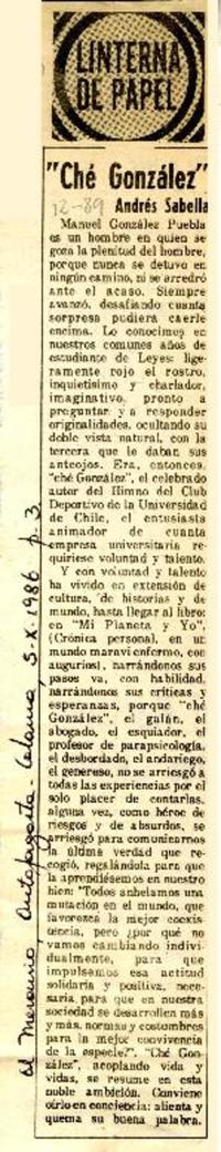 "Ché González" [artículo] / Andrés Sabella. El Mercurio (Antofagasta). -- oct. 5, 1986, p. 3. El Mercurio (Calama). -- oct. 5, 1986, p. 3. .